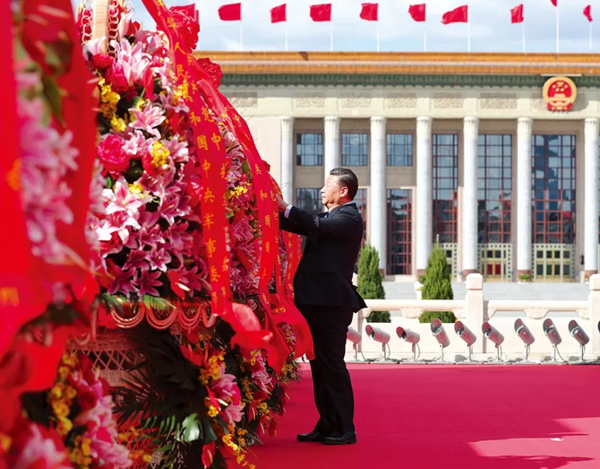 出席烈士紀念日向人民英雄敬獻花籃儀式。這是習近平整理花籃上的緞帶。新華社記者 謝環(huán)馳/攝
