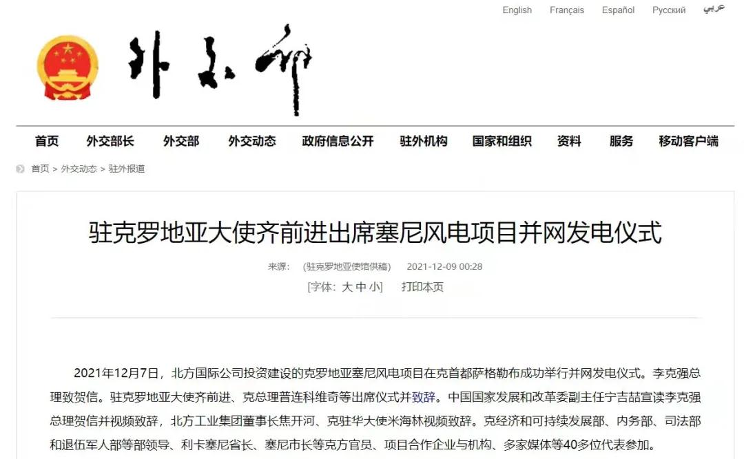 2021年12月7日,中國兵器工業(yè)集團有限公司北方公司所屬北方國際投資、建設和運營的塞尼156MW風電項目在克羅地亞首都薩格勒布隆重舉行并網(wǎng)發(fā)電儀式。李克強總理致賀信??肆_地亞總理安德烈·普連科維奇,中國駐克羅地亞大使齊前進出席儀式并致辭。中國國家發(fā)展和改革委員會副主任寧吉喆宣讀李克強總理賀信并視頻致辭,中國兵器工業(yè)集團有限公司董事長焦開河、克駐華大使米海林視頻致辭。 中華人民共和國外交部報道 普連科維奇總理在致辭中表示,感謝李克強總理發(fā)來賀信,他與中國領導人一直非常重視塞尼風電項目投資與建設。祝賀項目克服疫情與地震等影響,成功并網(wǎng)發(fā)電。增加清潔可再生能源、綠色電力對克乃至歐洲都很重要,克政府的重要戰(zhàn)略和目標之一就是低碳發(fā)展和增加清潔能源供應。塞尼風電項目占克總發(fā)電量將達3.5%,對克實現(xiàn)2022年可再生能源比例30%目標具有很大幫助。此次投資使北方國際成為在克最大的清潔能源投資企業(yè)。非常歡迎更多中國企業(yè)擴大對克投資。 寧吉喆宣讀李克強總理賀信并視頻致辭時表示,2017年11月第六次中國—中東歐國家領導人會晤期間,在李克強總理和普連科維奇總理等中東歐16國領導人的共同見證下,塞尼項目簽署了協(xié)議。項目既是中國堅定踐行綠色發(fā)展理念的具體體現(xiàn),也是中國深化與克羅地亞、與中東歐國家務實合作的生動實踐。希望中克兩國政府部門,企業(yè)等有關各方共同努力、相互配合,運營好塞尼項目,打造出中歐綠色合作的樣板,帶動兩國務實合作持續(xù)深入發(fā)展,造福兩國人民。 焦開河在致辭時表示,在塞尼項目投入運營之際,李克強總理專門致信祝賀。作為塞尼項目的投資方、建設方、運營方,我們備受鼓舞,深感自豪!未來,中國兵器工業(yè)集團有限公司將繼續(xù)深入貫徹落實習近平總書記重要指示批示精神和李克強總理賀信重要要求,以高標準、可持續(xù)、惠民生為目標,與克方合作伙伴坦誠溝通、攜手并進,進一步推動綠色能源建設,努力打造更多的“一帶一路”標志性、引領性、示范性項目,為鞏固中克戰(zhàn)略合作伙伴關系、推進中克從經(jīng)貿(mào)領域到全方位合作貢獻積極力量。 齊前進祝賀塞尼風電項目順利完工和成功并網(wǎng)發(fā)電。他表示,塞尼風電站項目并網(wǎng)發(fā)電是中克兩國領導人親自關注和推動的成果。作為迄今最大的中國在克投資合作項目,塞尼風電項目是中克和中歐綠色合作的典范,對克提高清潔能源生產(chǎn)消費發(fā)揮著重要作用。項目建設過程中為當?shù)嘏囵B(yǎng)了許多工程、技術和管理人才,帶動了當?shù)仄髽I(yè)發(fā)展,增加了就業(yè)和稅收,促進了當?shù)亟?jīng)濟社會發(fā)展,充分體現(xiàn)了中國對外經(jīng)貿(mào)合作與“一帶一路”倡議秉持的互利共贏、共同發(fā)展的理念,也是中國積極倡導的綠色低碳發(fā)展合作的典范。 塞尼項目位于克羅地亞中部亞得利亞海沿岸,建設總投資1.79億歐元,總裝機容量156MW,采用39臺4MW風力發(fā)電機組設備,風場面積達42.8平方公里。項目正式運營后,預計每年平均發(fā)電超3000小時,貢獻約5.3億度綠色電力,可減少二氧化碳排放約46萬噸,將為克羅地亞促進能源轉型、發(fā)展綠色經(jīng)濟提供強勁助力,貢獻了“中國智慧”“中國方案”。 來源/中華人民共和國外交部、綜合有關報道 |