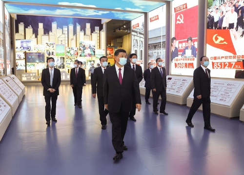 新近落成的中國(guó)共產(chǎn)黨歷史展覽館巍然矗立,氣勢(shì)恢宏。下午3時(shí)20分許,習(xí)近平等黨和國(guó)家領(lǐng)導(dǎo)同志來(lái)到這里,步入展廳參觀展覽。展覽以“不忘初心、牢記使命”為主題,精心設(shè)計(jì)了“建立中國(guó)共產(chǎn)黨 奪取新民主主義革命偉大勝利”、“成立中華人民共和國(guó) 進(jìn)行社會(huì)主義革命和建設(shè)”、“實(shí)行改革開(kāi)放 開(kāi)創(chuàng)和發(fā)展中國(guó)特色社會(huì)主義”、“推進(jìn)中國(guó)特色社會(huì)主義進(jìn)入新時(shí)代 全面建成小康社會(huì) 開(kāi)啟全面建設(shè)社會(huì)主義現(xiàn)代化國(guó)家新(人民日?qǐng)?bào))征程”4個(gè)部分,通過(guò)2600余幅圖片、3500多件套文物實(shí)物,第一次全方位、全過(guò)程、全景式、史詩(shī)般展現(xiàn)中國(guó)共產(chǎn)黨波瀾壯闊的百年歷程,濃墨重彩地反映黨的不懈奮斗史、不怕?tīng)奚贰⒗碚撎剿魇?、為民造福史、自身建設(shè)史,使人們深刻認(rèn)識(shí)到紅色政權(quán)來(lái)之不易、新中國(guó)來(lái)之不易、中國(guó)特色社會(huì)主義來(lái)之不易,深刻認(rèn)識(shí)到中國(guó)共產(chǎn)黨為什么能、馬克思主義為什么行、中國(guó)特色社會(huì)主義為什么好。