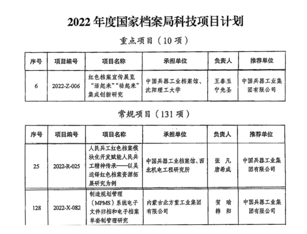 為深入貫徹落實《“十四五”全國檔案事業(yè)發(fā)展規(guī)劃》要求,著力提升檔案科研自主創(chuàng)新能力,根據(jù)《國家檔案局辦公室關(guān)于開展2022年度國家檔案局科技項目立項工作的通知》要求,中國兵器工業(yè)集團(tuán)檔案館(以下簡稱檔案館)依據(jù)《2022年科技項目立項選題指南》,組織各單位申報成功三個檔案科技項目在國家檔案局立項,其中一個項目為國家級10項重點項目之一,排名第六,這是繼2021年在國家檔案局首次立項三個項目后的又一重大突破,標(biāo)志著兵器工業(yè)檔案科研工作邁上新臺階。