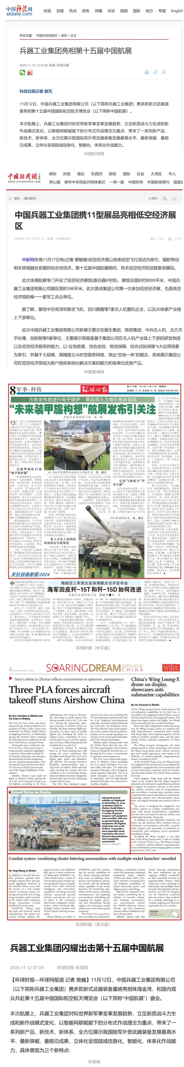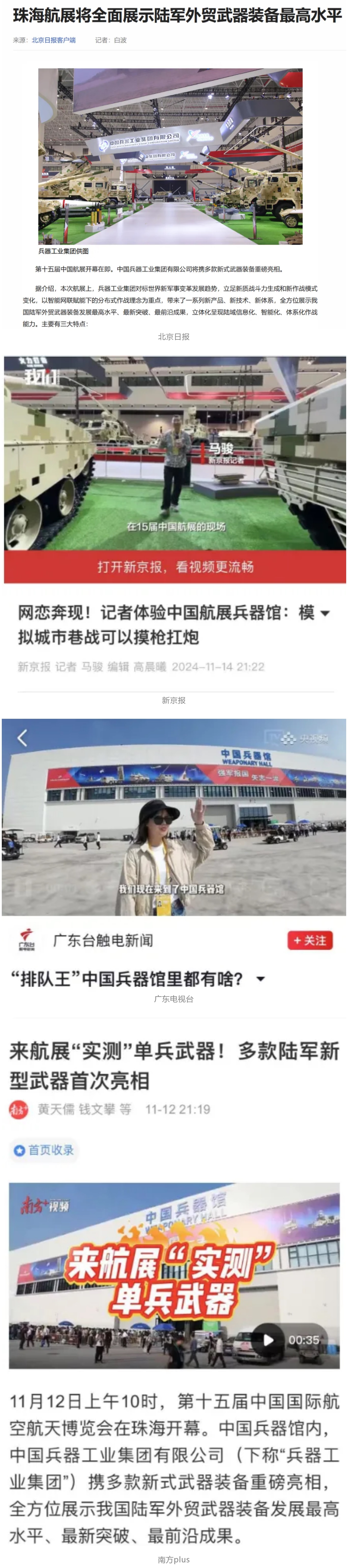 新華社、央視新聞、中央廣播電視總臺中國之聲、央視軍事、中國軍視網(wǎng)、廣東廣播電視臺等媒體以及國家國防科工局、國資小新等到兵器工業(yè)集團地面動態(tài)演示區(qū)、中國兵器館進行了直播。