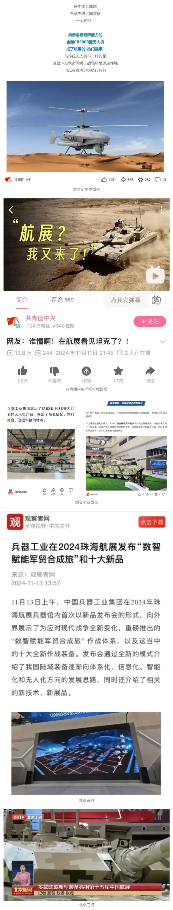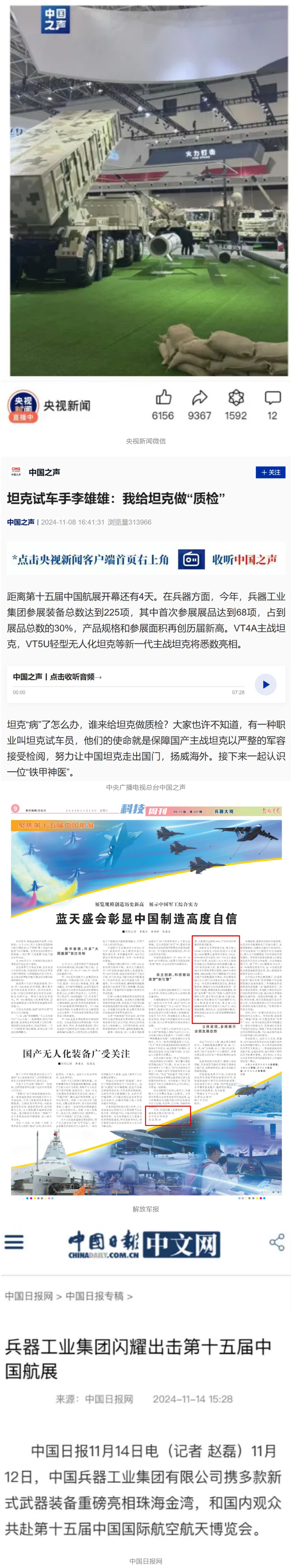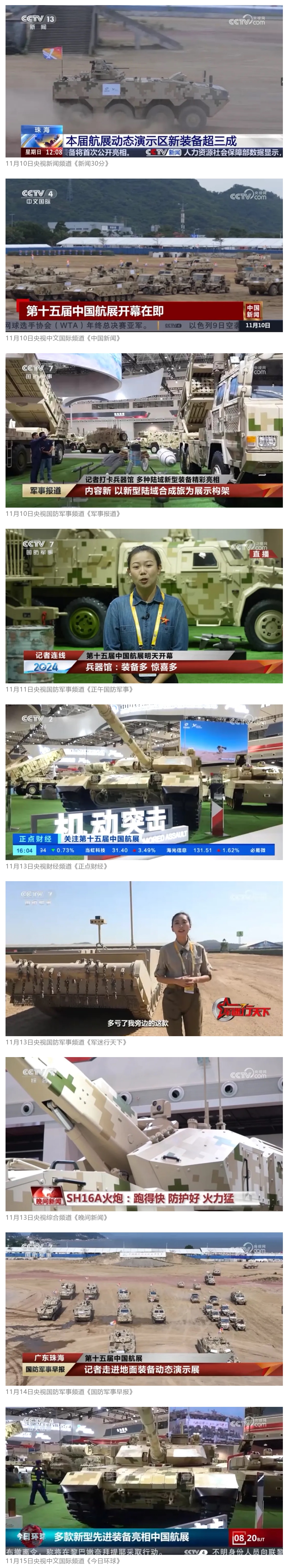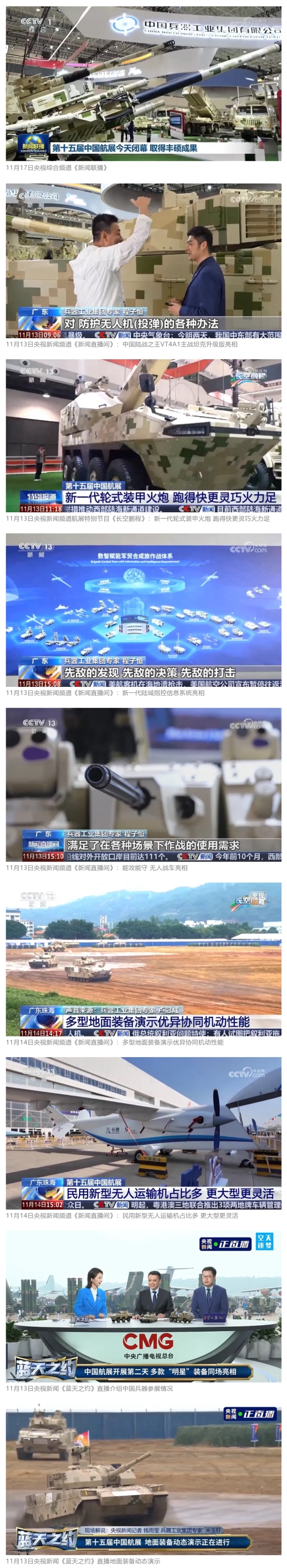 11月13日央視新聞《藍天之約》直播地面裝備動態(tài)演示此次航展,央視綜合頻道《新聞聯(lián)播》《晚間新聞》、新聞頻道《新聞直播間》《新聞30分》《朝聞天下》《共同關(guān)注》《東方時空》《午夜新聞》、財經(jīng)頻道《天下財經(jīng)》《經(jīng)濟信息聯(lián)播》《正點財經(jīng)》《第一時間》、中文國際頻道《今日環(huán)球》《中國新聞》、國防軍事頻道《軍事報道》《正午國防軍事》《國防軍事早報》《軍迷行天下》等欄目共播出兵器工業(yè)集團參展相關(guān)新聞報道40余條。11月10日央視新聞頻道《新聞30分》11月10日央視中文國際頻道《中國新聞》11月10日央視國防軍事頻道《軍事報道》11月11日央視國防軍事頻道《正午國防軍事》