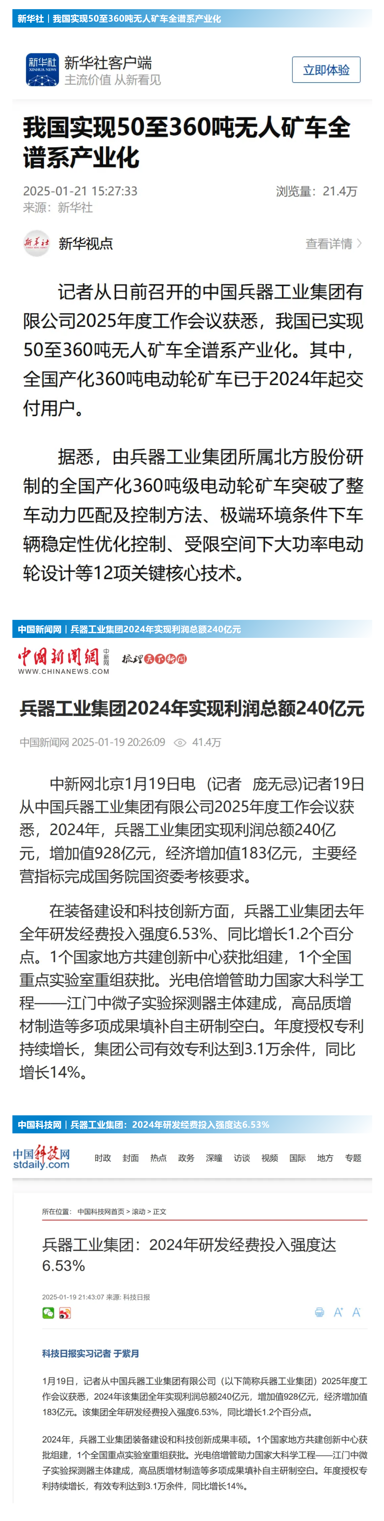1月19日至20日,中國兵器工業(yè)集團(tuán)有限公司2025年度工作會議在京召開,會議總結(jié)2024年工作,分析形勢任務(wù),明確工作思路,部署2025年工作。 集團(tuán)公司2024年取得的成績及下一步重點(diǎn)工作受到社會媒體廣泛關(guān)注。新華社、中國新聞網(wǎng)、中國科技網(wǎng)、光明日報(bào)客戶端、經(jīng)濟(jì)日報(bào)客戶端、中國日報(bào)網(wǎng)、國務(wù)院國資委網(wǎng)站、學(xué)習(xí)強(qiáng)國中央企業(yè)學(xué)習(xí)平臺、新浪網(wǎng)、網(wǎng)易網(wǎng)、搜狐網(wǎng)、騰訊網(wǎng)、鳳凰網(wǎng)等中央主流媒體、國家部委網(wǎng)站及知名網(wǎng)絡(luò)媒體對集團(tuán)公司2025年度工作會議進(jìn)行了報(bào)道,重點(diǎn)關(guān)注集團(tuán)公司經(jīng)營業(yè)績、科技創(chuàng)新、產(chǎn)業(yè)結(jié)構(gòu)布局優(yōu)化等情況。其中,新華社以《我國實(shí)現(xiàn)50至360噸無人礦車全譜系產(chǎn)業(yè)化》為題,重點(diǎn)報(bào)道了集團(tuán)公司在推動智能制造水平提升方面取得的成效;中國新聞網(wǎng)、光明日報(bào)客戶端、經(jīng)濟(jì)日報(bào)客戶端、中國日報(bào)網(wǎng)等就集團(tuán)公司2024年度經(jīng)營業(yè)績及各項(xiàng)工作取得的成果進(jìn)行報(bào)道;中國科技網(wǎng)著重報(bào)道了集團(tuán)公司在科技創(chuàng)新和優(yōu)化產(chǎn)業(yè)結(jié)構(gòu)布局方面的最新進(jìn)展。集團(tuán)公司門戶網(wǎng)站、微信公眾號、微博等新媒體平臺以及《中國兵工報(bào)》也對集團(tuán)公司工作會議進(jìn)行了及時(shí)報(bào)道,各成員單位紛紛對相關(guān)內(nèi)容進(jìn)行轉(zhuǎn)載,引發(fā)全系統(tǒng)關(guān)注。 集團(tuán)公司職工及廣大網(wǎng)友熱議工作會 “2025年工作會為我們指明了發(fā)展方向、明確了奮斗目標(biāo),面對全新的機(jī)遇和挑戰(zhàn),作為兵工人深感責(zé)任重大?!?/p> “科技是第一生產(chǎn)力,一定要以科技創(chuàng)新引領(lǐng)新質(zhì)生產(chǎn)力發(fā)展,為高質(zhì)量發(fā)展提供支撐?!?/p> “把各項(xiàng)工作做深、做實(shí)、做細(xì),努力為集團(tuán)公司高質(zhì)量發(fā)展添磚加瓦?!?/p> “2024年中國兵器展示了大國重器,祝新的一年中再創(chuàng)輝煌!” |